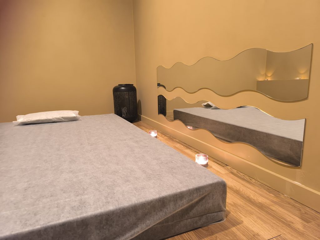 O espaço dispõe de todas as comodidades necessárias para uma experiência plena e com toda a discrição, contando com gabinetes privados equipados com duche e climatização, bem como todos os artigos de higiene necessários.